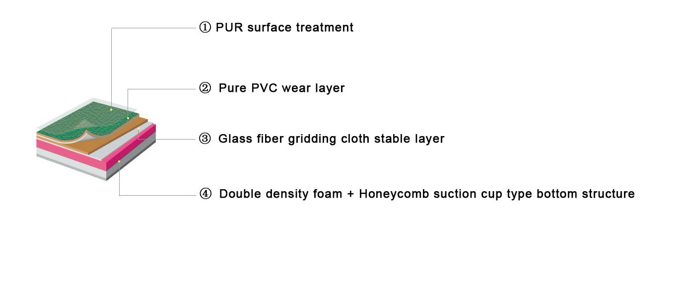 La superficie del producto adopta la capa resistente al desgaste de color puro ultra resistente al desgaste, la capacidad de recuperación de indentación aumenta en 50%, y la dureza de la superficie aumenta en 26%. La capa estable de tela de malla de fibra de vidrio garantiza la dimensión estabilidad del producto, que puede dispersar la fuerza de impacto instantánea y garantizar que el piso no se rompa y se deforme en el uso a largo plazo.